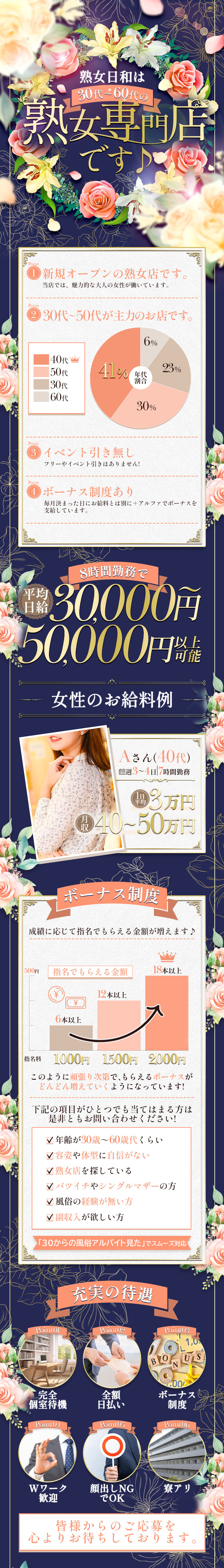 - ✨熟女日和オープニングキャスト大募集✨ ■安心して働ける環境 ✨全室個室待機 ✨容姿・年齢・体型は一切不問 ✨採用基準は「人柄」だけアリバイ対策も完全対応! ■働きやすさをとことん追求毎月ボーナス支給!交通費支給 WワークOK・週1~OK ブランクがあっても大歓迎もちろん即日体験入店も可能!