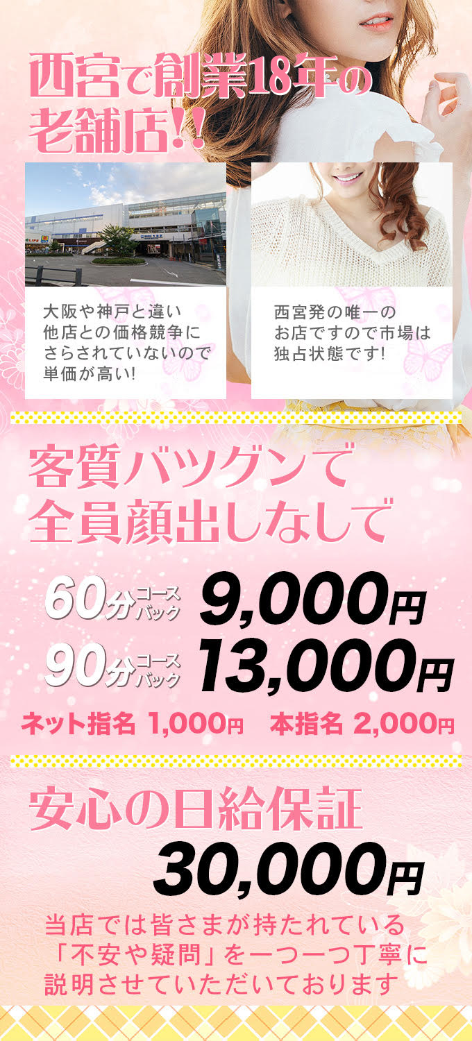 2.当店は西宮で14年の営業実績があるお店です。地元のお客様の圧倒的な支持のもと営業してまいりました。お店の固定客が多いので新人入店すればHPのアクセスが急上昇し必ず稼げます。
