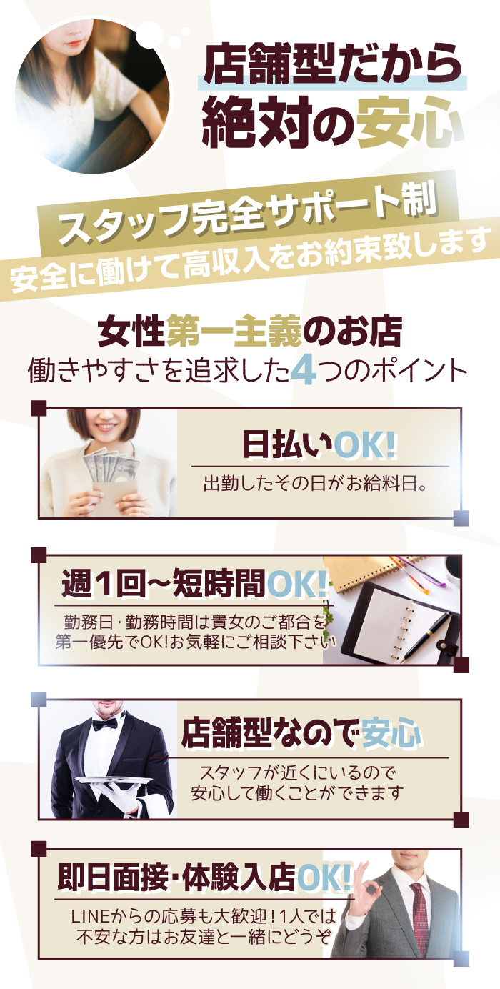 また常連のお客様が多いお店なので集客も安定しており、高収入を約束できます。 - 女性店長だから安心