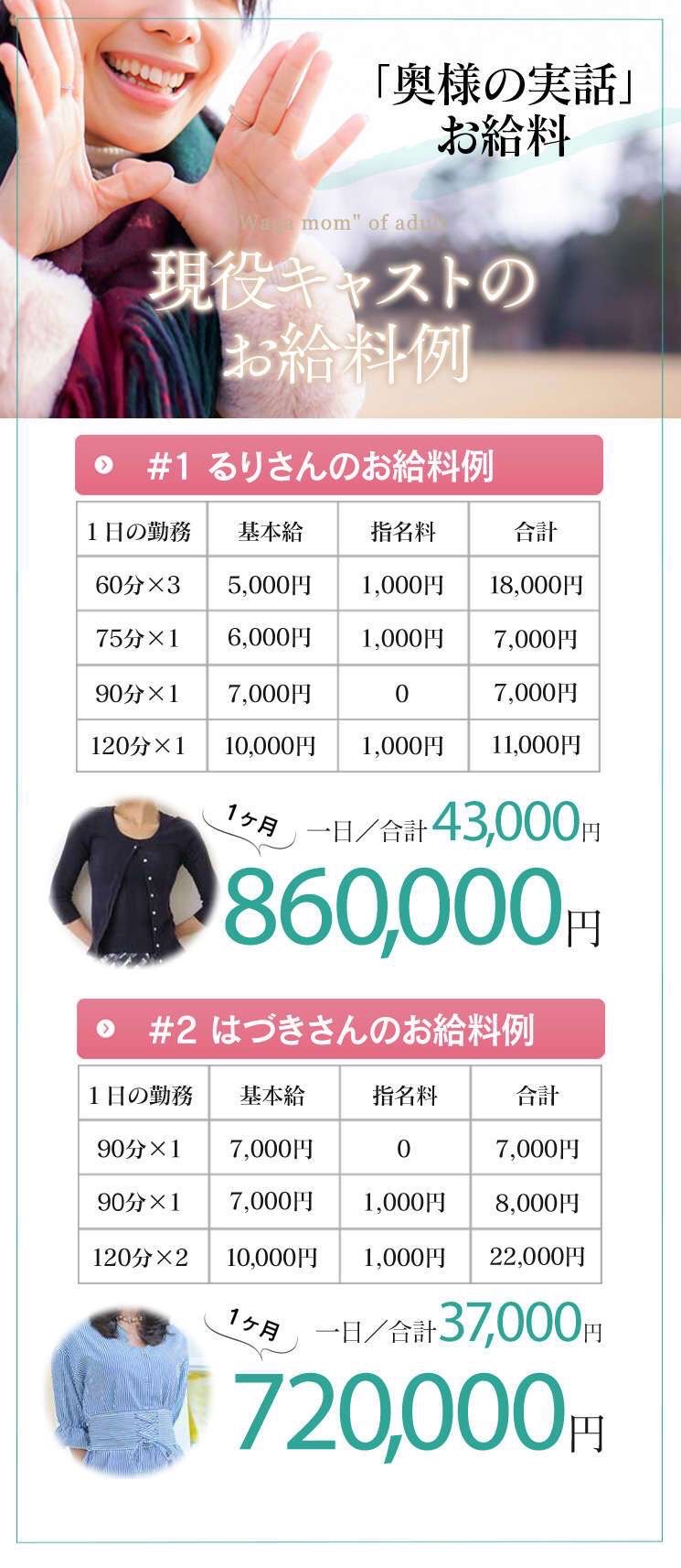 - 『奥様の実話』は入店月からコースバック60分7,000円が可能!!さらに翌月には8,000円のコースバックも狙えるんです。高いバック率で安定して稼げますよ♪