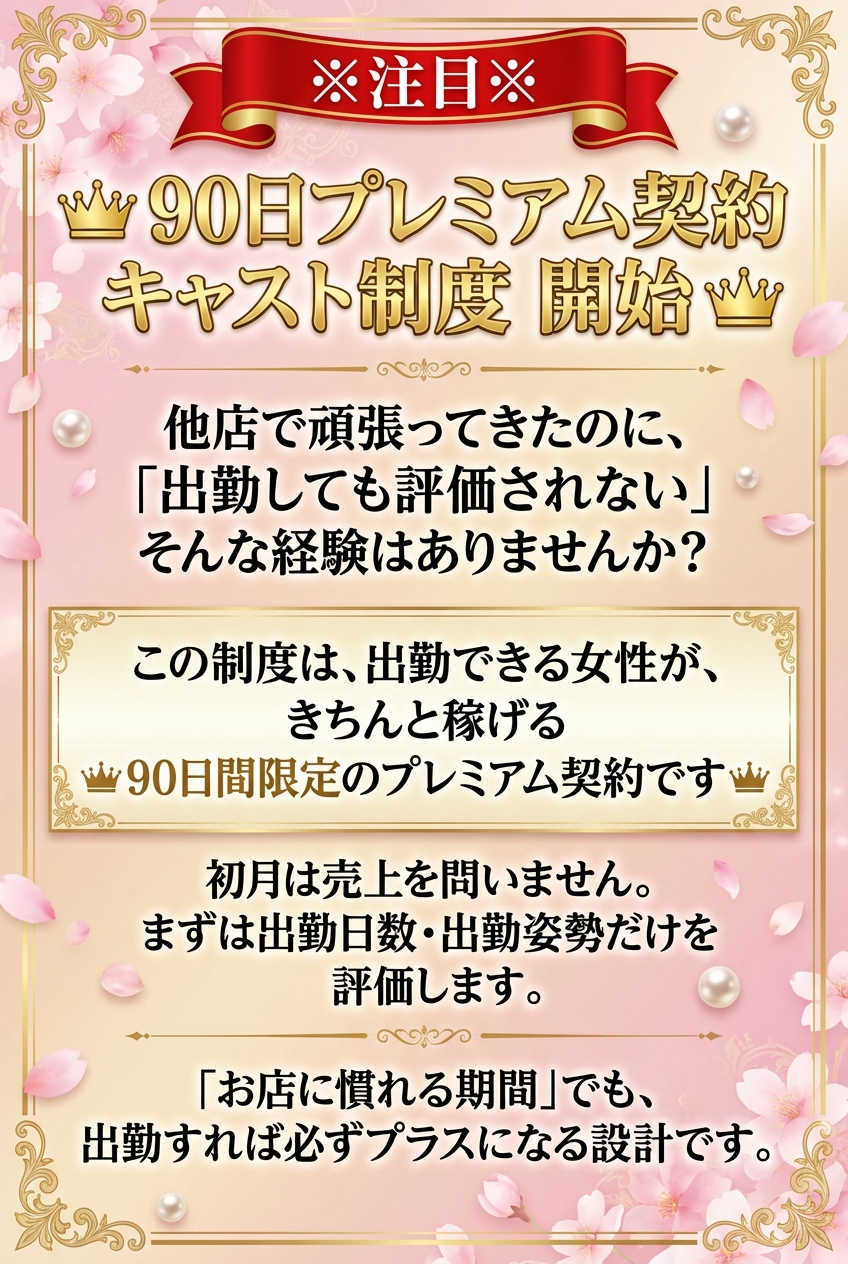 出勤できる女性が、一番稼げる90日。毎月3名限定「※枠が埋まり次第終了」/最大23.5万円成果連動ボーナス