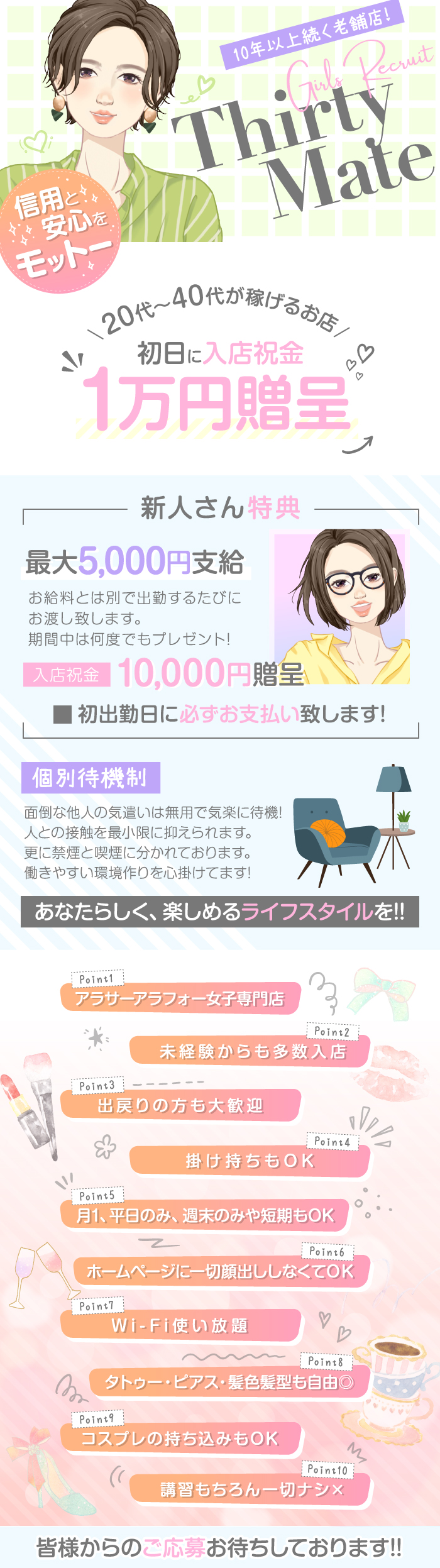 さらに、初出勤初日に入店祝金最大10,000円支給!よくある「入店○ヶ月後に支給」とか「○回出勤したら支給」の細かい条件はありません。本当に初日から稼いでいただける環境です! - 環境抜群!個室待機&駅から徒歩2分!