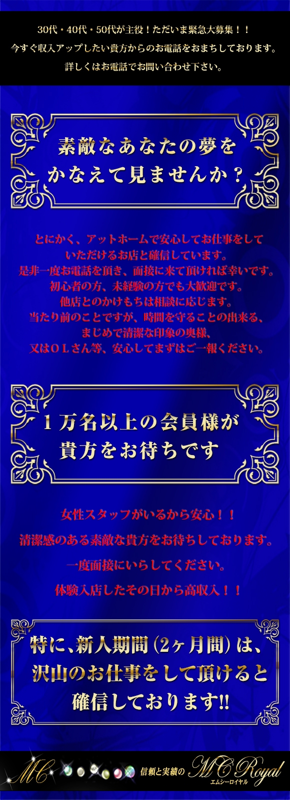 時間を守る事のできる、真面目で清潔な印象の奥様、又はOLさん等、安心して、お電話くださいね。