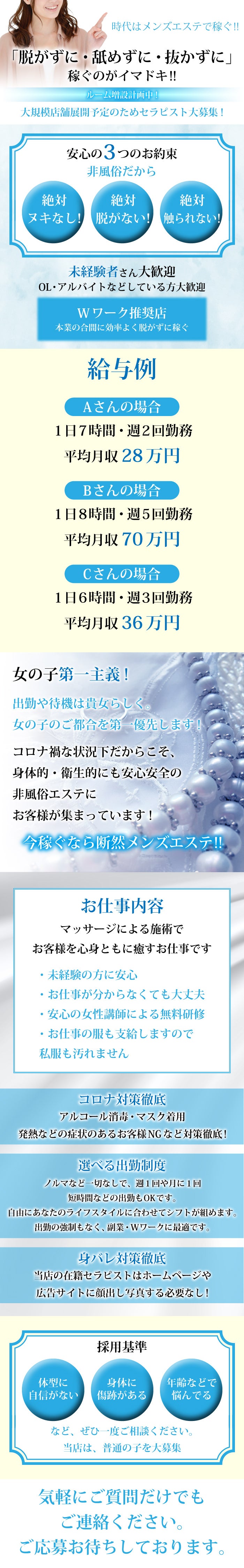 - 衣服を脱いだり、ヘルス店や風俗エステのようなプレイはありません。マッサージについてはしっかりとした研修を行っておりますので、未経験の方でも安心してご応募ください。
