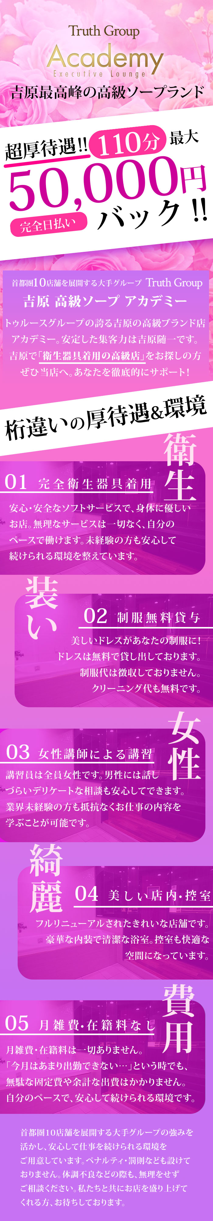 【アカデミー】は、安心して働ける環境づくりにこだわった高級ソープランドです。