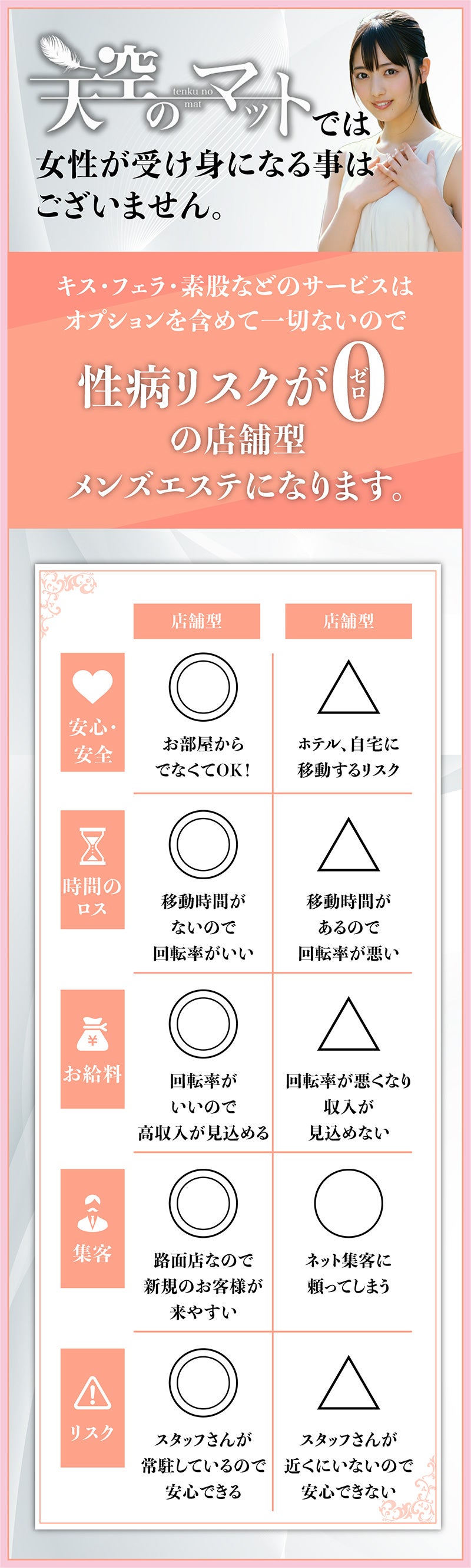 粘膜接触などのヘルスプレイがないので、未経験者さんも安心して体験入店が可能です。
