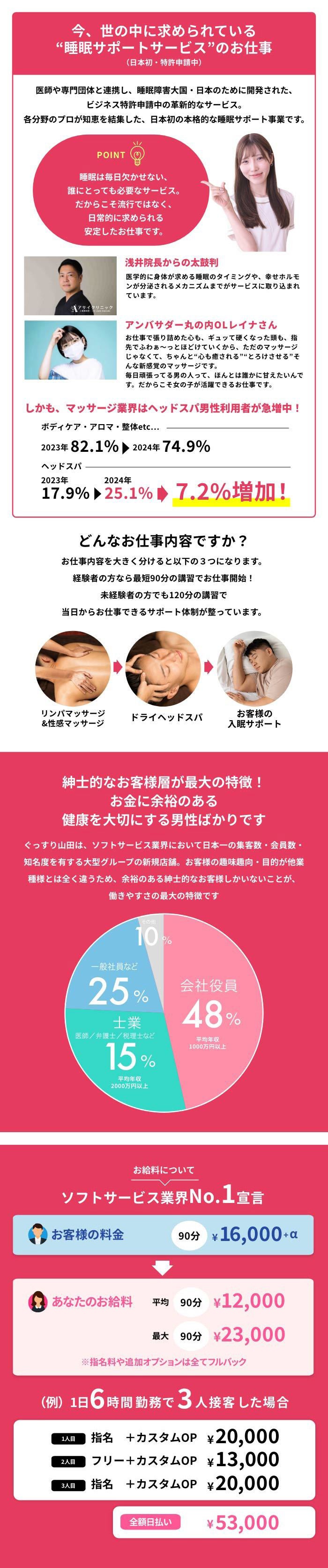 お給料は全額現金で、施術後に即日受け取れます。- どんなお客様が中心ですか?トラブルの心配はありませんか?