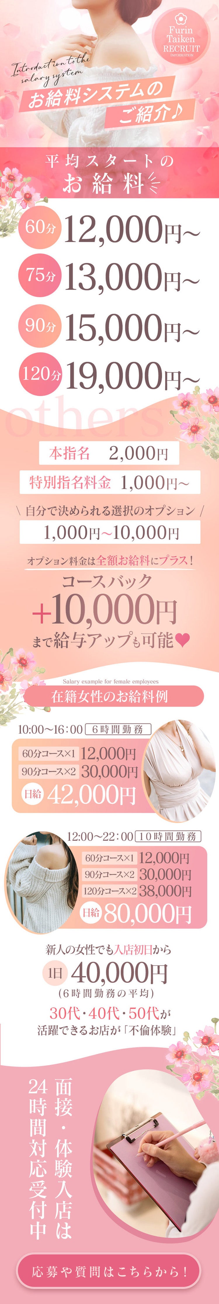 60分9000円スタート☆完全全額日払い制・本指名料2000円全額バック・基本オプション全額バック☆ ご希望に合わせて稼げるプランを形成し、目標金額を達成出来るように取り組みます!