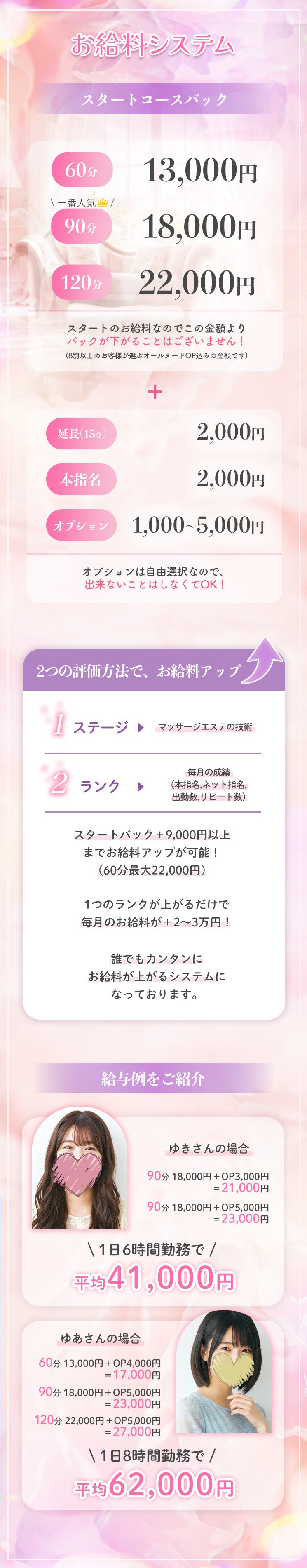 新人期間や短期集中で稼ぎたい方だけでなく、「なるべく長く高収入を稼ぎたい」という女性の頑張りが、きちんと報われる昇給システムとなっております。